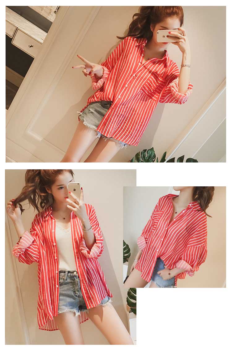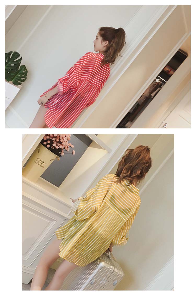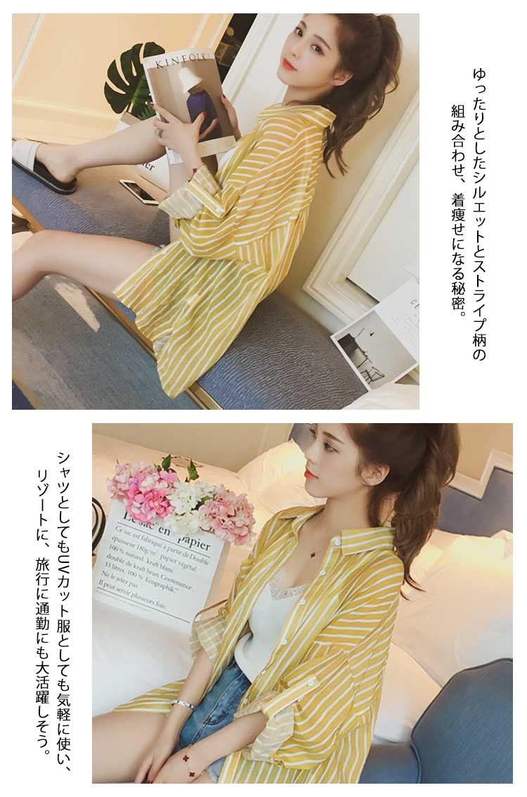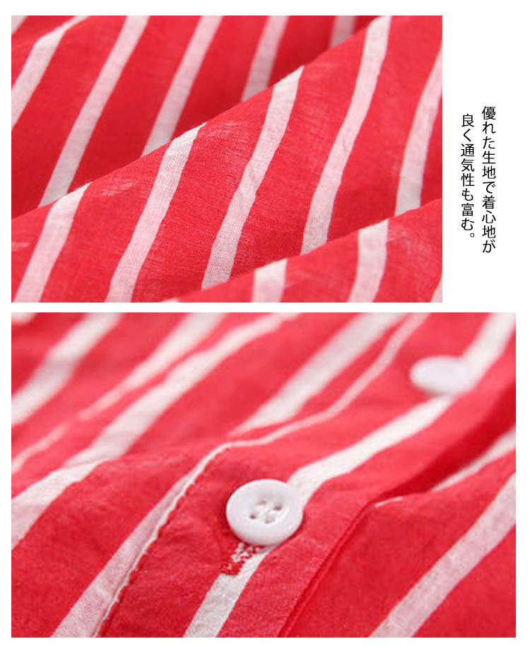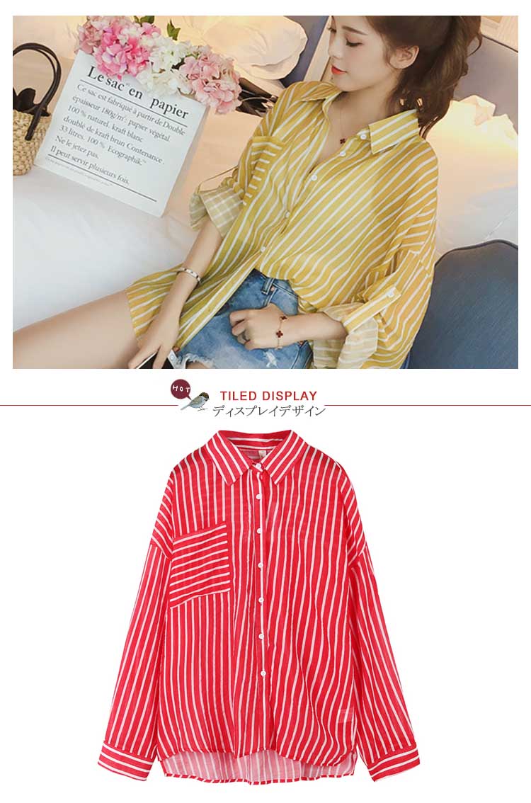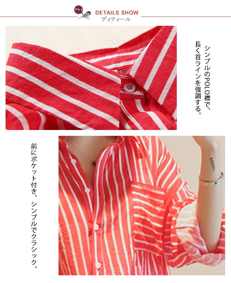| 明るくて清々しいイメージを与えるブラウス。ドルマンスリーブのデザイン、ゆったりとして、太い腕を隠せ、着用も楽。ゆったりとしたシルエットとストライプ柄の組み合わせ、着痩せになる秘密。シャツとしてもUVカット服としても気軽に使い、リゾートに、旅行に通勤にも大活躍しそう。 | |