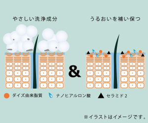 優しい洗浄成分で不要な汚れを取った後、セラミド2とダイズ由来脂質(PEG-30 フィトステロール)、ナノヒアルロン酸(加水分解ヒアルロン酸)が地肌を整え、