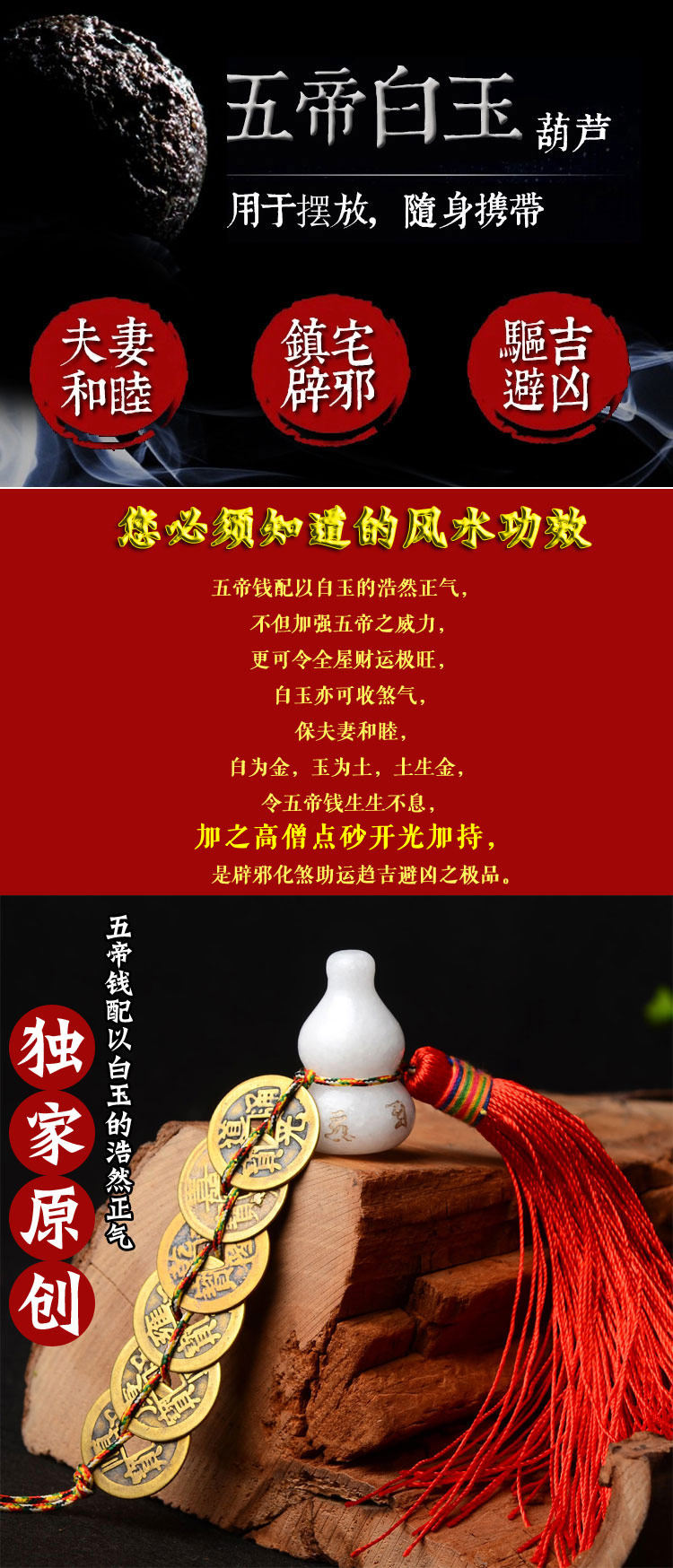三、化解户外医院坟场公检法等煞气。葫芦收邪祛晦,五帝钱有五帝之威,若家宅离一些污秽、冤气、邪灵等场所很近,将此葫芦配五帝钱挂于邻近以上场所的门窗,可解。