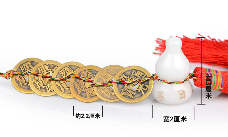 二、化户外煞。葫芦圆圆凸起的外形,可反射外来冲撞之气,五帝钱外圆内方,牢不可破,故葫芦配五帝钱能化解各种户外冲撞煞气。如路冲煞、尖射煞、飞刃煞、枪煞、镰刀煞、剪刀煞等煞。用法,挂于家中,朝向有煞的方向。