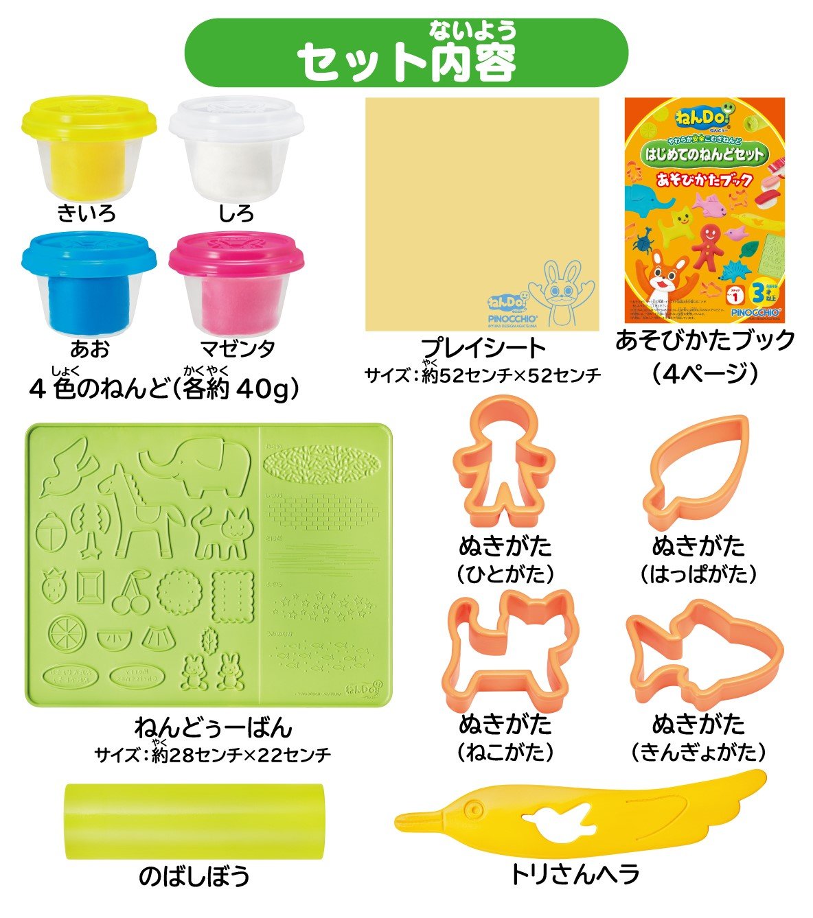 Nendo 4 colors (each 40 g white, blue, magenta, yellow), dolphins, extruded (4 types), birds spatula, sticks, how to play BOOK, play sheet
