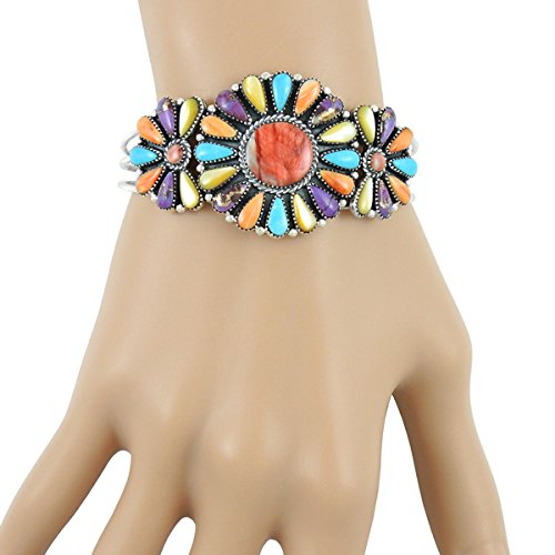 Exciting Southwest-style cluster bracelet in solid 925 sterling silver, genuine semiprecious gemstones.Choose from different colors of genuine turquoise or multi-color (which contains turquoise, spiny oyster shell and mother-of-pearl).