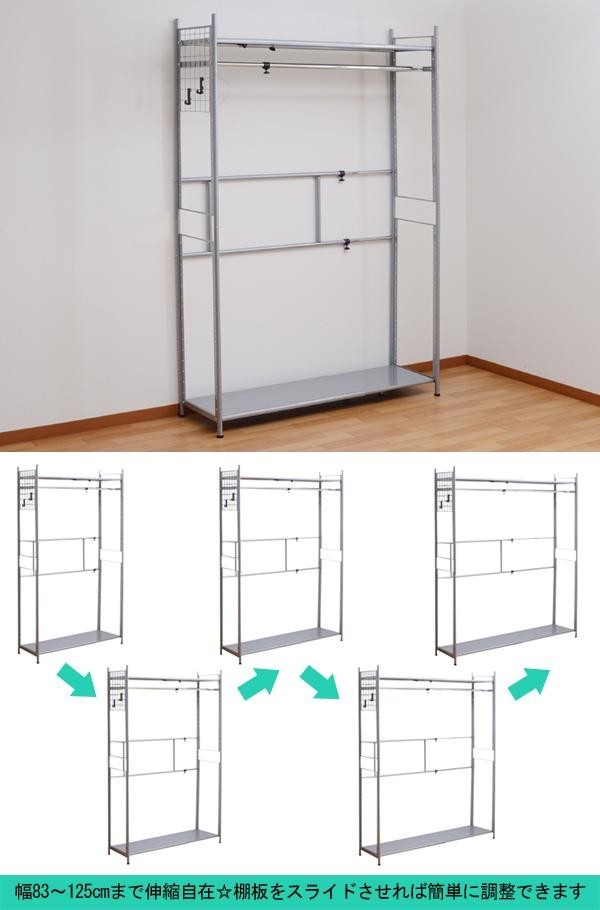 収納が欲しい場所の上部の空間を有効活用☆衣類収納からキッチン収納まで多用途に使える頑丈なスチールラックです。幅は83~125cmの間で伸縮自在!!また、棚板とバーは5cmピッチで調整可能。お部屋の広さや収納するもののサイズに合わせてお使い頂けます。 |