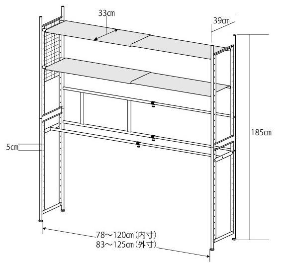 | 収納が欲しい場所の上部の空間を有効活用☆衣類収納からキッチン収納まで多用途に使える頑丈なスチールラックです。幅は83~125cmの間で伸縮自在!!また、棚板とバーは5cmピッチで調整可能。お部屋の広さや収納するもののサイズに合わせてお使い頂けます。 |