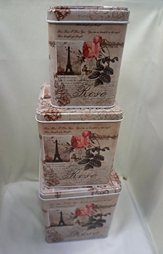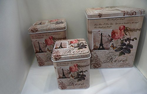 Elegant Pairs themed Storage Tins, Shabby Chic, With Eiffel Tower Pattern and Floral Roses Design Set of 3