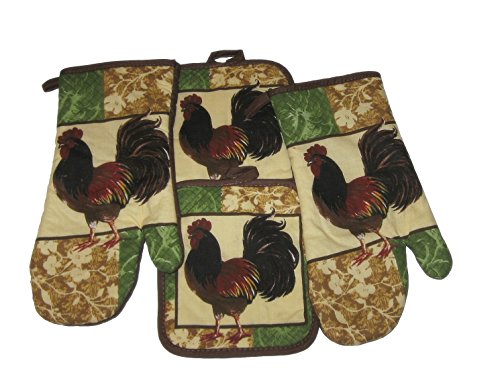 Rooster Brown Green Cotton Oven Mitts and Potholders Set (4 Items)