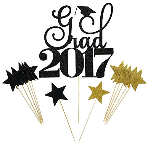 - 2017 Graduation Decorations Rich and Varied: One packaging include monogram "2017 Grad" cake topper 1 pack, star cupcake toppers 12 counts.