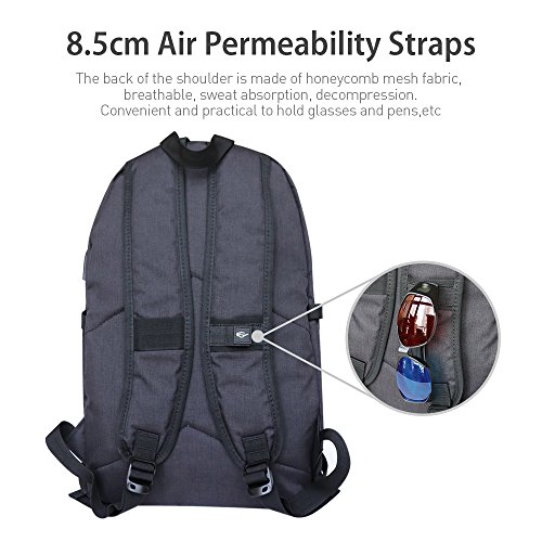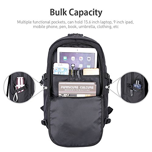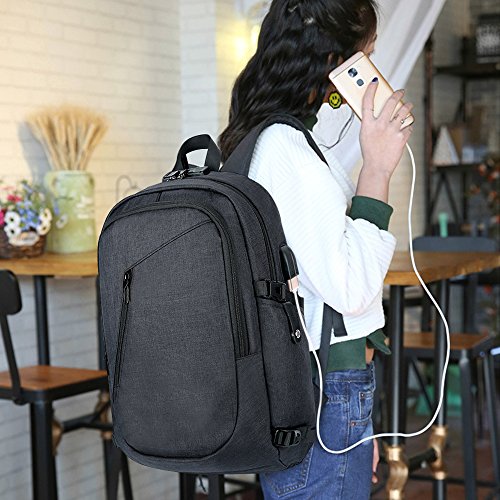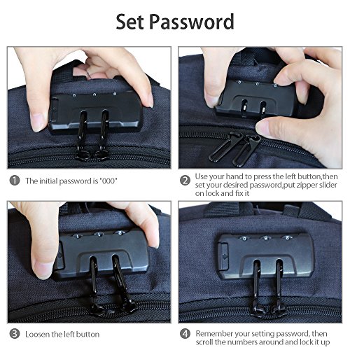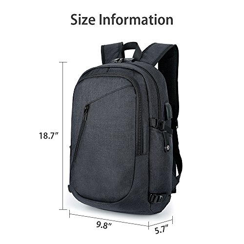 -. Feature : [High Quality Material] This slim business laptop backpack is Made of durable and breathable water resistant oxford cloth material, lightweight and rain-resistant, sturdy stitching and firm straps, without loose threads or sloppy seams, / [Large Capacity]USB charging backpack is well designed with multi-functional compartments. There are 3 main pockets (with 9 inner smaller pockets) and 2 side pockets. The internal structure is with computer sidekicks, mobile phone bags, document bags, zipper bag, patch pocket and pen bag. You could organize all of your stuff with this laptop backpack / [Anti-theft Password Lock] You could keep the thieves away with the password lock built in this laptop bag to make your laptop, wallet and other items safe and secure while you going outside, Its 10+ functional pockets are available for storing your laptop, tablet, phone, books, clothes, umbrella, folders and other articles.uld keep the thieves away with the password lock to make your laptop, wallet and other items safe and secure while you going outside / [External USB slot with Built-in Charging Cable]This notebook bag is great to enjoy the convenient charging by connected with the portable charger and your electronic device, easily keep your smart phone full of power anytime and anywhere / [Comfortable Practical Computer Backpack] Always feel well balanced on your back and comfort for carrying heavy stuffs for your daily travel, this slim business laptop backpack fits to all 15.6 inch laptops and meets your needs with 44 pounds load-bearing.