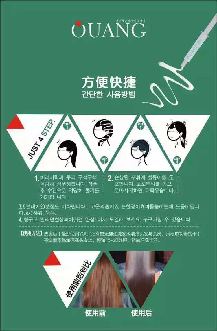 一管短发2-3次,长发1-2次,看个人用量而定 洗完头发,在不滴水的情况下,把膏均匀涂在头发上(护发素一样)然后再把一次性浴帽带上,保持15分钟到20分钟后去下,用温水冲洗即可。