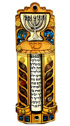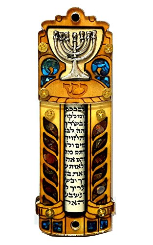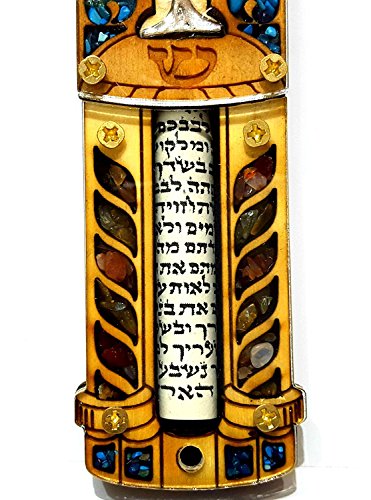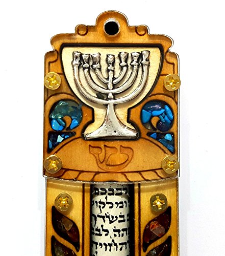 Jewish MEZUZAH CASE With SCROLL Menorah Wood & Gemstones Israel Judaica Door Mezuza 4"