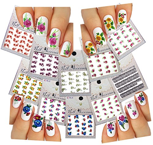 FLOWER & LACE NAIL TATTOOS - 10 sheets of elegant flowers in variety of colors and black lace