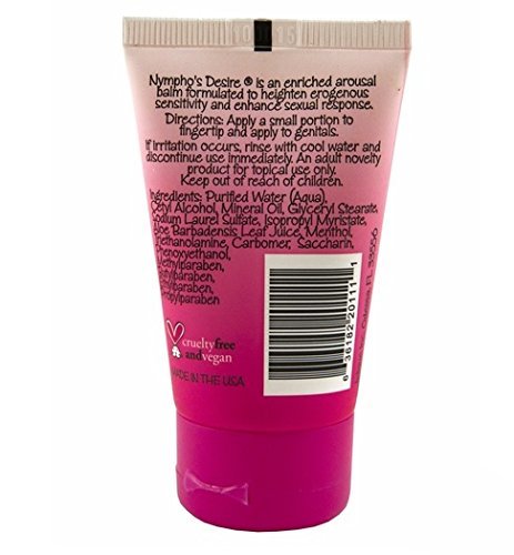 -. Binding : Health and Beauty -. Brand : Caresse -. EAN : 0702380569060 -. Feature : Nympho's Desire is specially formulated for women, to help intensify and enhance the female orgasm. It is truly a favorite amongst the ladies. This silky balm brings out the DESIRE in all who try it. / Polyurethane condom compatible and Compatible with most lubricants / Does not contain any flavor, color or sugar, Gluten-free and Lactose-free / Fast acting so you can achieve the most mond blowibng "O" and washes off with water for easy clean up / No animal byproducts, and 100% Body Safe -. IsAdultProduct : 1 -. Label : Jelique Products Inc -. Manufacturer : Jelique Products Inc -. PackageQuantity : 1 -. ProductGroup : Health and Beauty -. ProductTypeName : HEALTH_PERSONAL_CARE -. Publisher : Jelique Products Inc -. Studio : Jelique Products Inc -. Title : Women's Sexual Arousal Vegan Balm for Intense Orgasms and Increased Stimulation Lubricant (1.5 oz) -. UPC : 702380569060