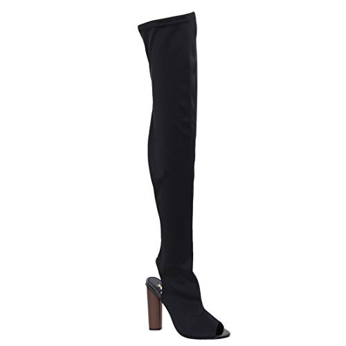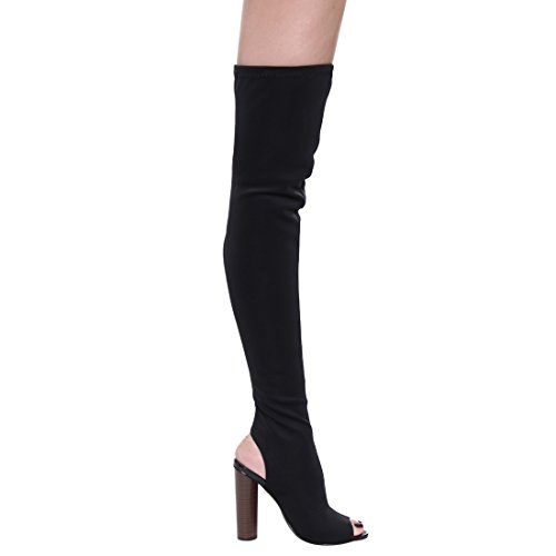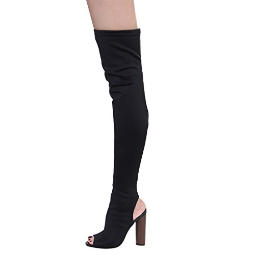 Product Description Add a feminine touch to your ensemble with these women's chunky stacked heel peep toe thigh high boots.Designed with backless,solid color,stiching details. 0