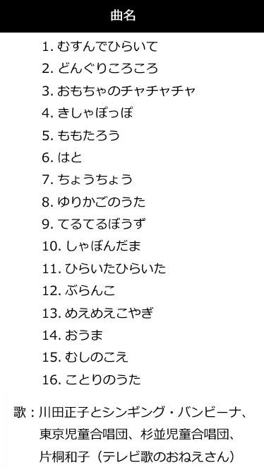 「むすんでひらいて」「どんぐりころころ」「おもちゃのチャチャチャ」他、子供から大人まで、みんなに愛される定番の童謡がはいったアルバムです!