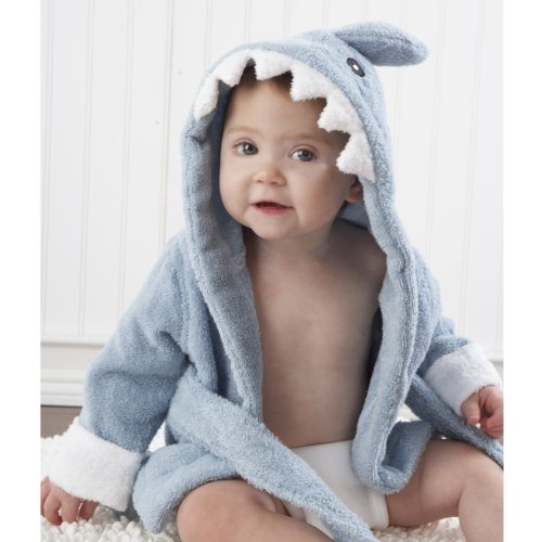 Sea-blue terry robe with white cuffs, two terry ties in front, a hood with smiling, white shark's teeth, appliquéd black eyes and a dorsal fin accent. Bottom of robe resembles a shark's tail.