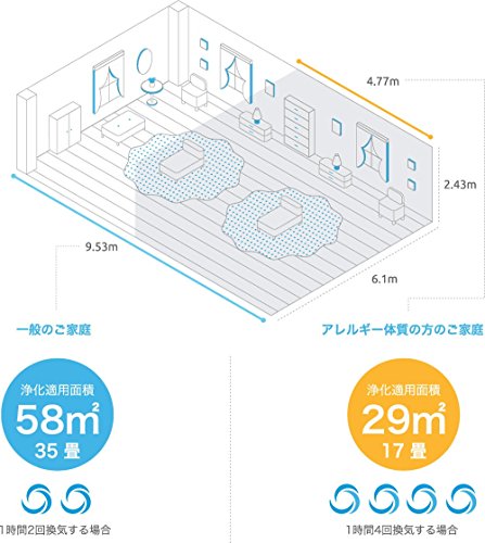 공기 청정 능력:일반 가정(2 ACPH):58평방미터,알레르기 체질의 분(쪽,편)의 가정(4 ACPH):29평방미터,크기:56.4H x 42.2W x 24.9D,보증기간:5년간,고객서포트:《라빗도에아》일본 법인