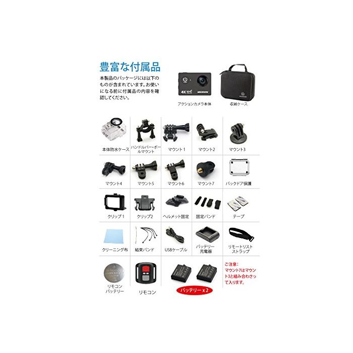 【풍부한 악세사리 안심 메이커1년간 보증】방수 케이스나 평상시 사용으로 편리한 네이키드 암,삼각으로 설치 하기 위한 어태치먼트 등 많은 종류의 악세사리가 부속 하고 있으므로,여러가지 씬으로 활용으로 옵니다.Gopro와 호환성이 있습니다.●전원 어댑터는 부속 되어 있지 않습니다만,USB케이블 에서의 충전과 부속 충전기 에서의 충전이 가능하기 때문에 안심 하십시오.●일본어의 취급 설명서가 부속 하고 있기 때문에,처음 분에서도 안심하고 이용 하실 수 있습니다.●만일 상품에 불편이 있는 경우는,폐사에 연락 해 주시면 일본어 스탭이 신속하게 대응 하겠습니다.구입 후12개월의 메이커 보증이 붙어 있으므로,아마존의 구입 이력 보다 폐사로 연락 하십시오.