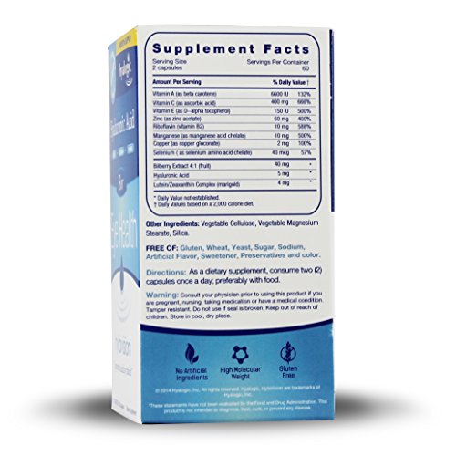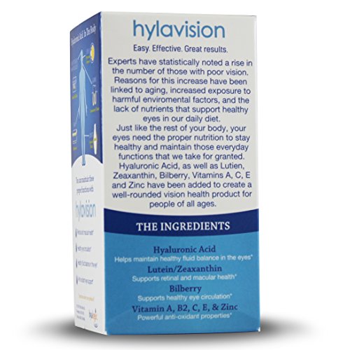 -. Title : HylaVision - Supports Healthy Vision With Hyaluronic Acid - Lutein - Zeaxanthin - Bilberry Extract - Vitamin A, C, & E - Zinc By Hyalogic - 120 Capsules
