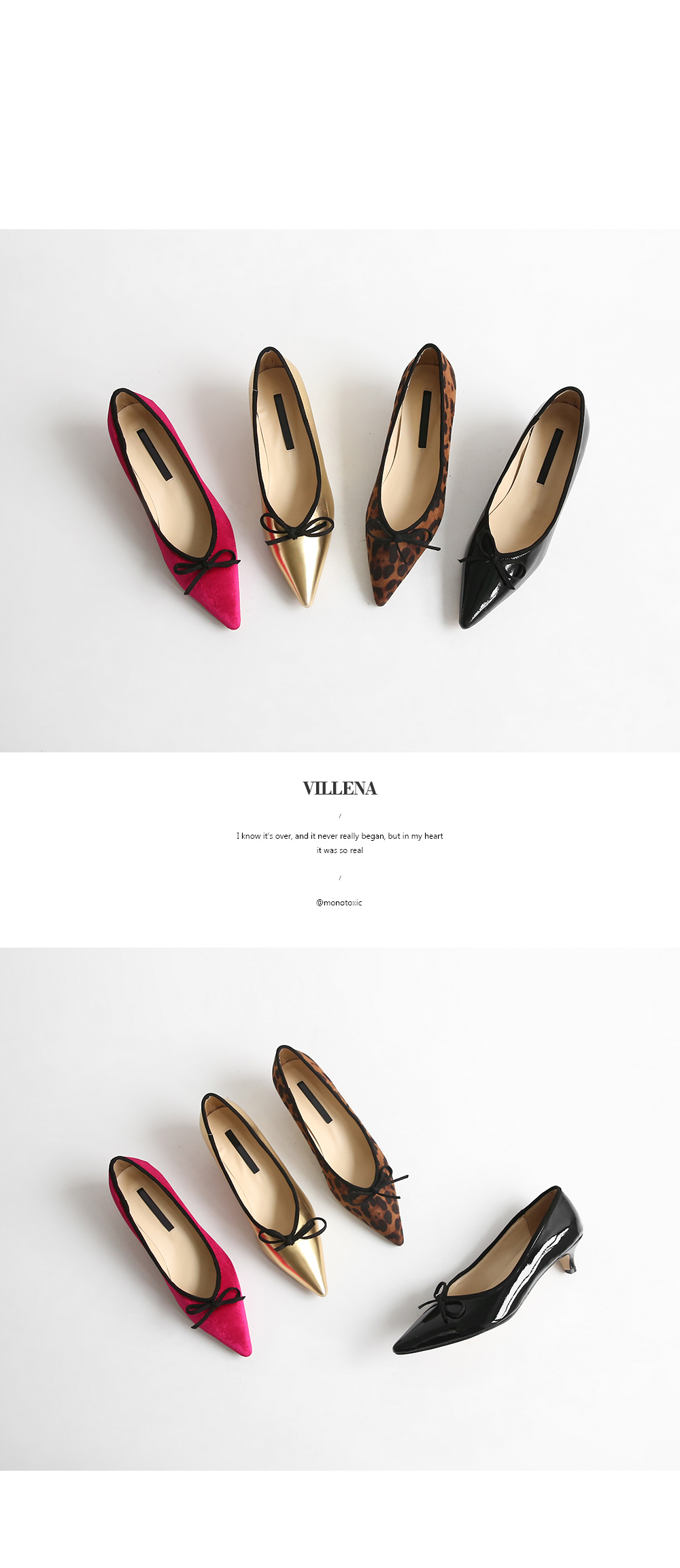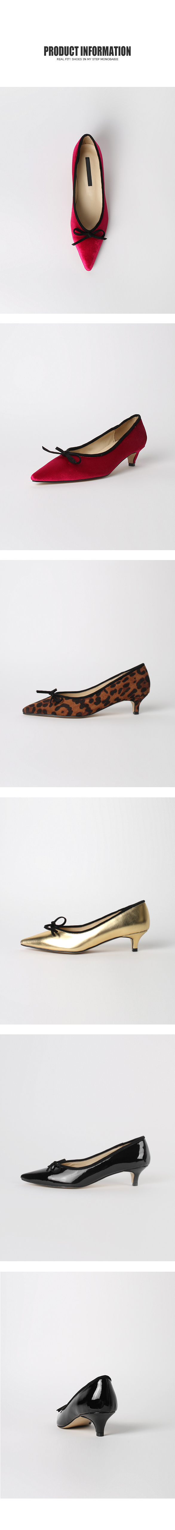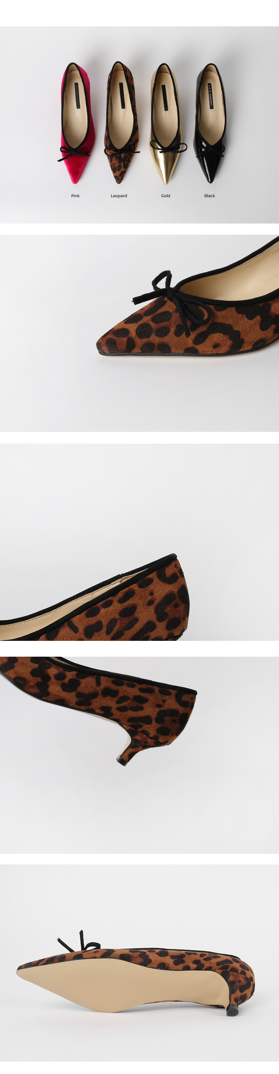 에나멜의 블랙컬러, 페이크 스웨이드의 레오파드, 페이크 소가죽의 골드컬러, 벨벳 소재의 핑크컬러로 다양한 소재로 구성된 데일리 로우굽의 펌프스입니다.