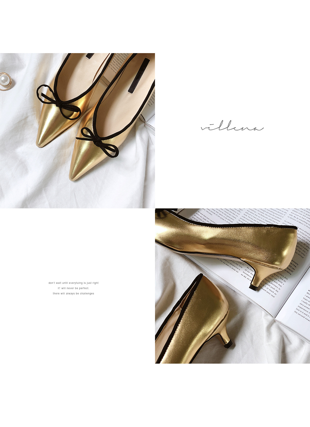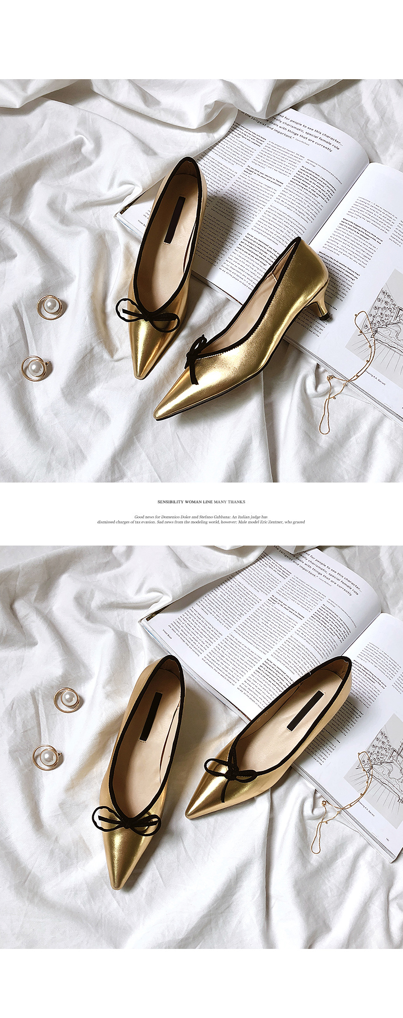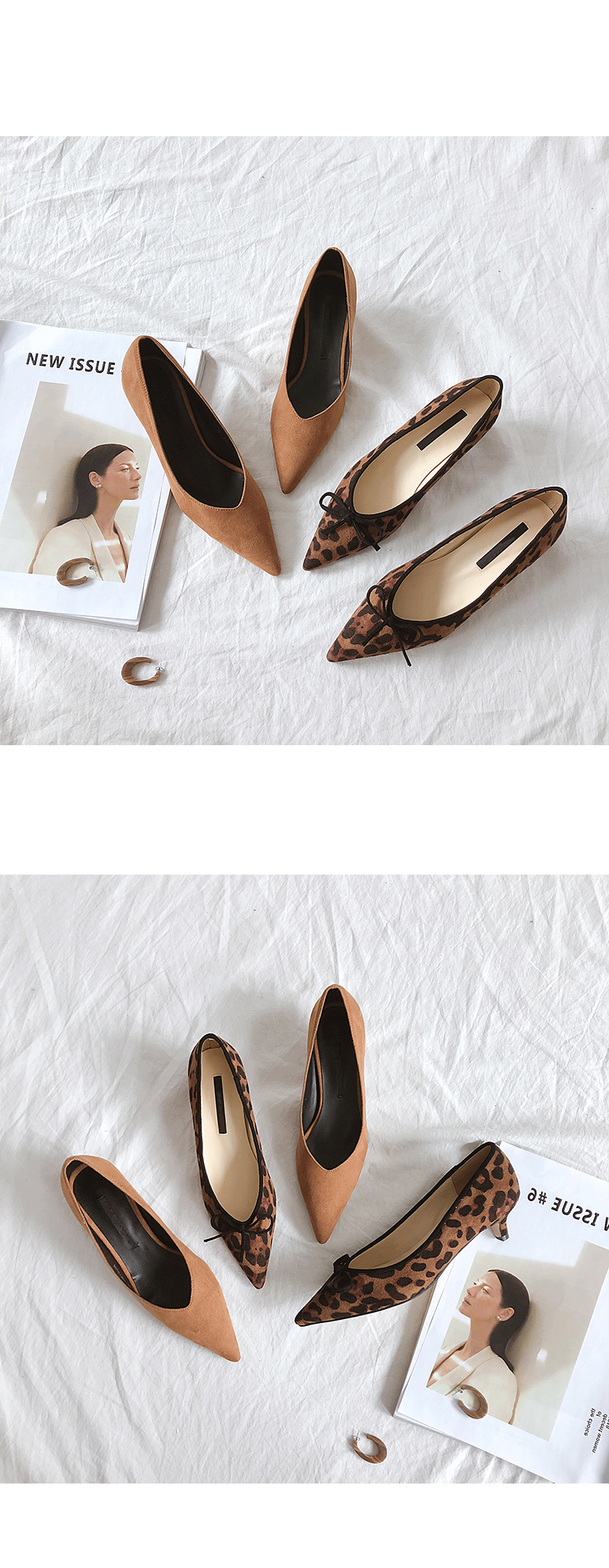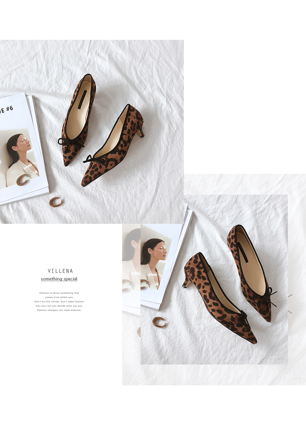 에나멜의 블랙컬러, 페이크 스웨이드의 레오파드, 페이크 소가죽의 골드컬러, 벨벳 소재의 핑크컬러로 다양한 소재로 구성된 데일리 로우굽의 펌프스입니다.