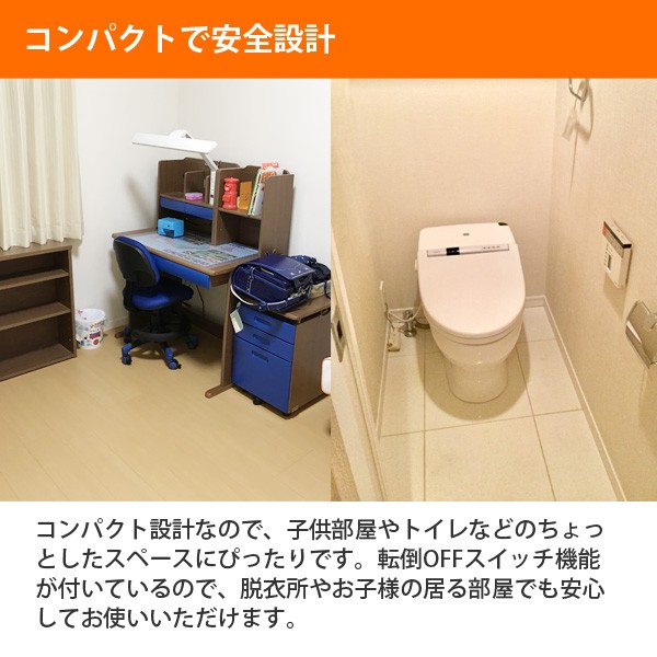 子供部屋や脱衣所などにもOK!●転倒OFFスイッチ搭載本体サイズ (約)幅26×奥行14×高さ37cm重量 (約)2.3kg消費電力 1200W/600W電気代 (約)32.4円/時(1200W時)検索キーワード:暖房 家電 電気暖房 あったか ヒーター 電気ヒーター セラミックファンヒーター 600W 1200W パワフル 転倒防止 転倒OFF 切替 コンパクト 小型 子供部屋 トイレ キッチン 洗面所
