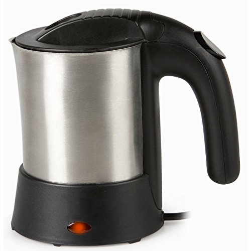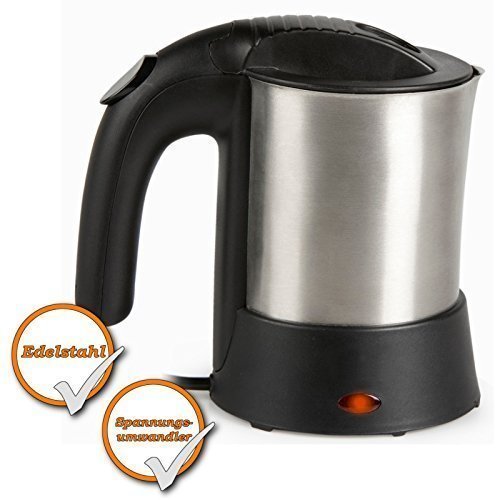-. Feature : Edelstahl-Wasserkocher / Feste Basisstation / 0,5 Liter Volumen / Spannungsumwandler 110 + 230 Volt / Automatische Abschaltung + Überhitzungsschutz