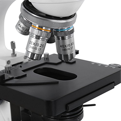 Forward-facing nosepiece with 4x, 10x, 40xS (spring), and 100xS (spring, oil) DIN achromatic objectives that provide color correction of magnified images