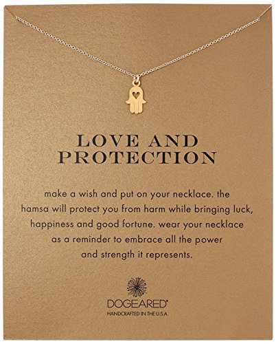 -. Binding : Jewelry -. Brand : Dogeared -. Department : womens -. Feature : Gold-plated necklace featuring small Hamsa Hand pendant on keepsake card / Rolo chain with sP.R.Ing-ring clasp / Items that are handmade may vary in size, shape and color / Made in the USA -. Label : Dogeared -. Manufacturer : Dogeared -. Model : MRSS200525820-Parent -. MPN : MRSS200525820-Parent -. PartNumber : MRSS200525820-Parent -. ProductGroup : Jewelry -. ProductTypeName : FASHIONNECKLACEBRACELETANKLET -. Publisher : Dogeared -. Studio : Dogeared -. Title : Dogeared Love Protection Pendant Necklace, 18"