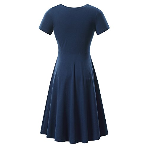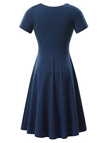 Women Short Sleeve Round Neck Summer Casual Flared Midi Dress (Medium, Navy)