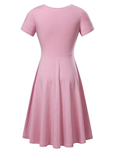 Women Short Sleeve Round Neck Summer Casual Flared Midi Dress (Medium, Rose)