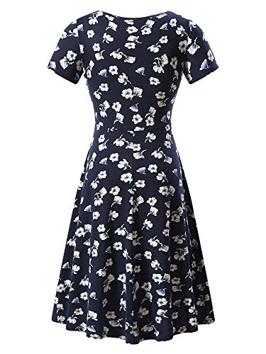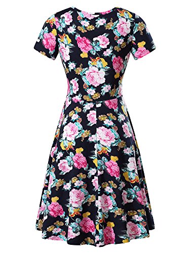 Women Short Sleeve Round Neck Summer Casual Flared Midi Dress (M, Navy Peony)