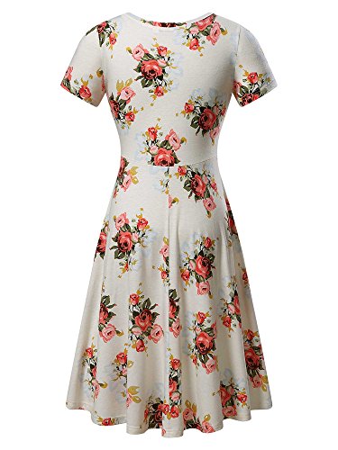 Women Short Sleeve Round Neck Summer Casual Flared Midi Dress (L, Beige Peony)