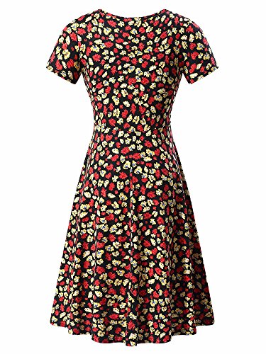 Women Short Sleeve Round Neck Summer Casual Flared Midi Dress (Large, Red Peony)