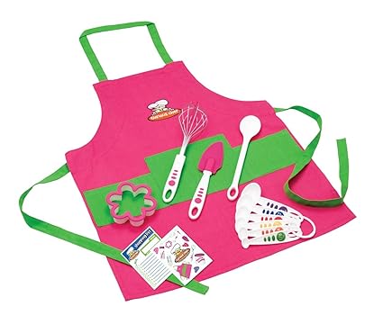 [Product Information]- Our Curious Chef 11-piece Pink Chef Kit has a bright pink apron, 6-piece measuring spoon set, a whisk and a large silicone mixing spatula