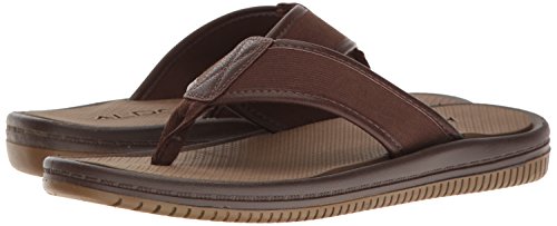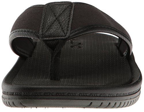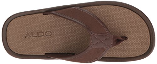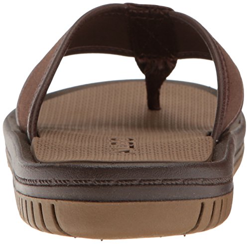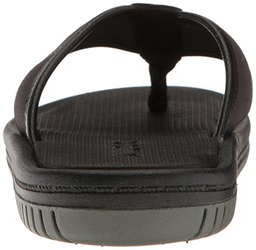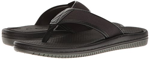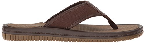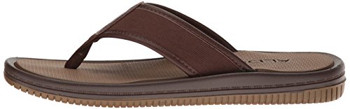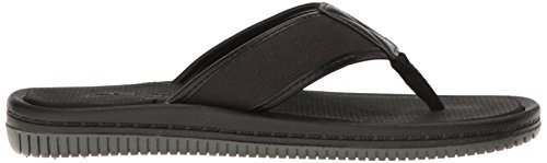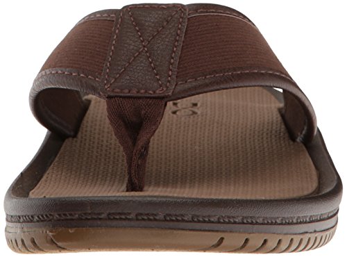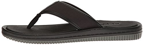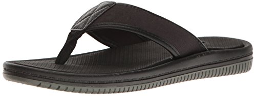 Comfortable flip flop featuring wide straps, synthetic trim, and cushioned footbed