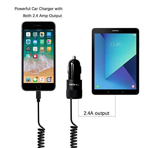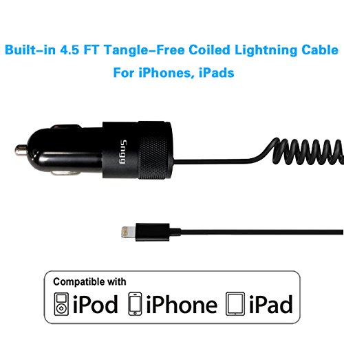Car Charger, Sngg 4.8A Rapid USB Car Charger Adapter with 4.5-feet Coiled Lightning Cable for iPhone 7 / 7 Plus ,6S / 6S Plus, 6 / 6 Plus , / SE / 5s / 5c / 5 and More,with Extra USB Port (Black)