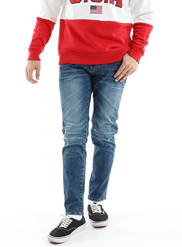 -. Feature : ★平日14時までのご注文は“即日配達”※土日/祝日を除きます。 / 【サイズ 単位:約cm】 表記:1(S)|2(M)|3(L) ウエスト:74|78|82 股上:23|24|25 股下:70|71|72 ワタリ:23|24|25 裾幅:14|15|16 / 【カラー】 インディゴ / 【素材】 綿98% ポリ2% / 【モデルデータ】 身長173cm 体重58kg 2(M)サイズ着用 【商品説明】 色落ちにダメージやクラッシュ、ヒゲやアタリなど実際に穿き込んだような“リアル”なユーズド感が魅力のスキニーデニムパンツです。 スリムフィット×テーパードラインで設計した抜群の細身シルエット。 しっかりとした生地ながらもストレッチデニムによって動作性に優れるところもポイントです。 また、ウエストの内回りにゴムを貼り合せた事で、よりフィット性や穿き心地の良さが期待できる仕上がりです。 フロントジッパーフライ、ベーシックな5ポケット仕様で仕立て上げています。
