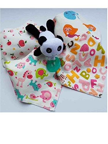 -. Binding : Apparel -. Brand : Assured Deals Smoketree Novelties -. Color : Pink Red Black and White -. Department : baby-girls -. EAN : 0600153560415 -. Feature : 100% Polyester Plush: Soft and Cuddly Toy holds the pacifier securely and permanently. / 100% Cotton Bandanas 4 Pack: Two layers thick, reversible and adjustable to use through toddler years. Large triangle shape can be used as a burp cloth for newborns. / Easy Care: Machine wash/ dry gentle cycle. Non chlorine bleach. / BPA Free Silicone Clip: Bonus Clip has strong grip but won't harm fabric. / 100% Guarantee: Our bandanas and pacifiers are designed to impress, but should they be returned, you get a money back guarantee per Amazon's terms and policy. -. IsAdultProduct : 0 -. MPN : 43224-12628 -. PackageQuantity : 2 -. PartNumber : 43224-12628 -. ProductGroup : Apparel -. ProductTypeName : ACCESSORY -. Size : 1 -. Title : Girl Panda Pal Pacifier Toy Plush with Clip and 4 Pack Bandanas Two Layers Thick and Reversible -. UPC : 600153560415
