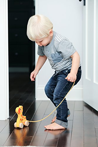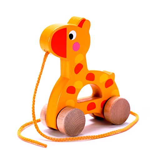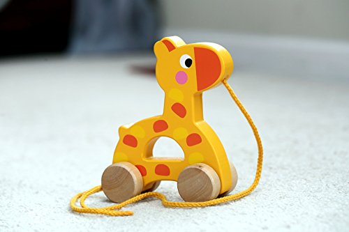 - Adorable Pull-Along Giraffe on four wheels with 2 feet of hard wearing yellow string