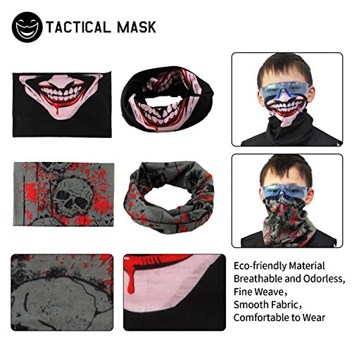 Safety glasses protect your eyes in the fight and shocked your competitor with a rapier glance. 2pcs cool tactical masks in different looking, made of non-toxic and breathable fabric, offering an awesome frightening visual impact in your outdoor activity and hide your true identity in the battle