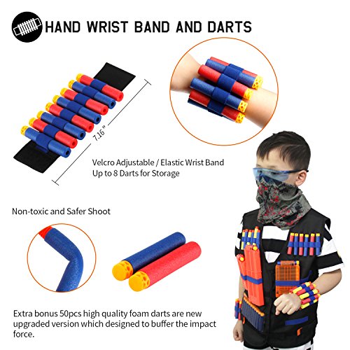 Great Value: Includes 1 x Tactical Vest + 3 Quick Reload Clips + 2 x Hand Wrist Band + 1 x Protective Glasses/Vision Gear + 2 Tactical Masks + 50 Refill Darts Soft Bullet + 1 x Portable Carry-out String Bag