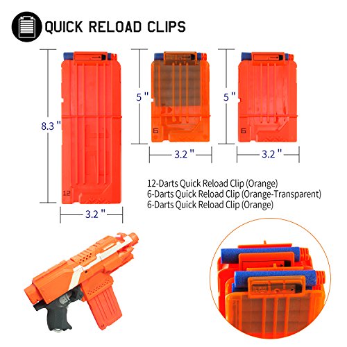 2pcs of 6-darts reload clips and 1pcs of 12 darts reload clip work with all nerf n-strike elite blasters and most original n-strike blasters. Extra bonus 50 Darts are new upgraded version which designed to buffer the impact force. Non-toxic and safer shoot