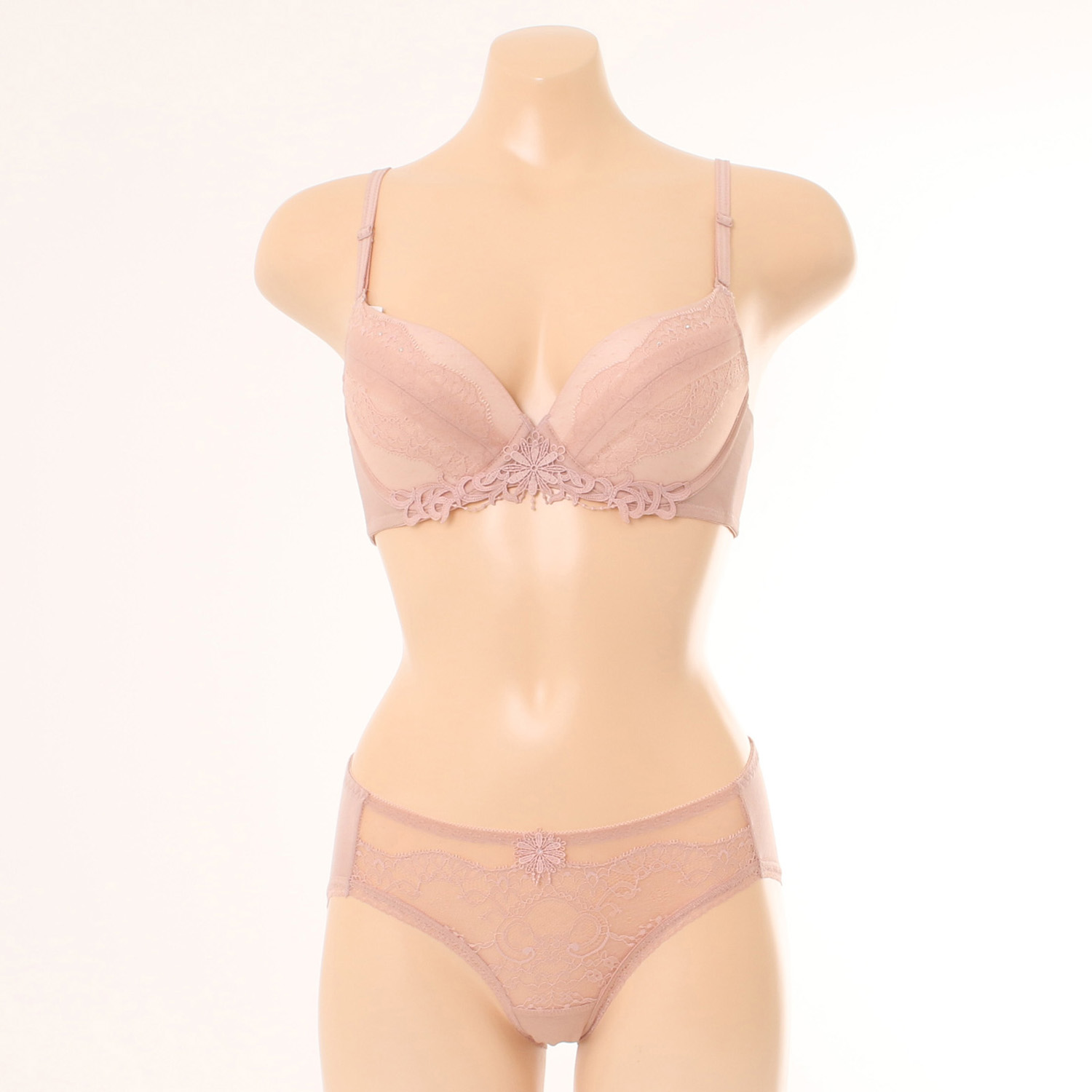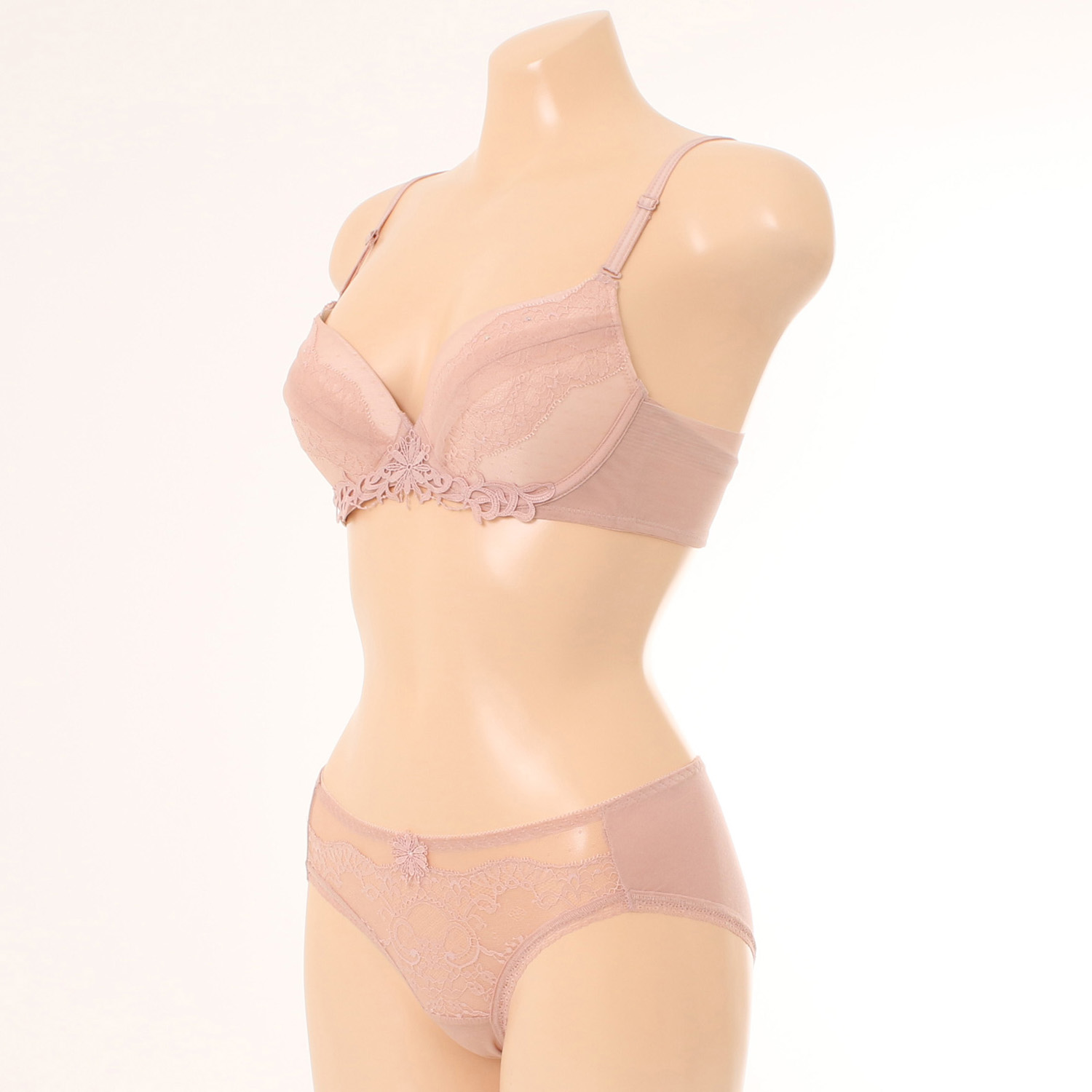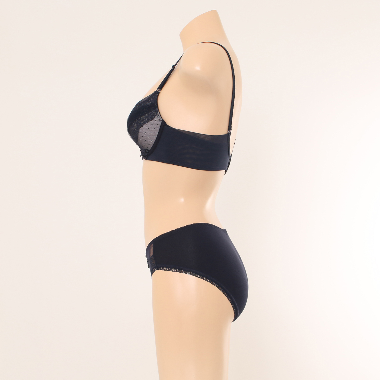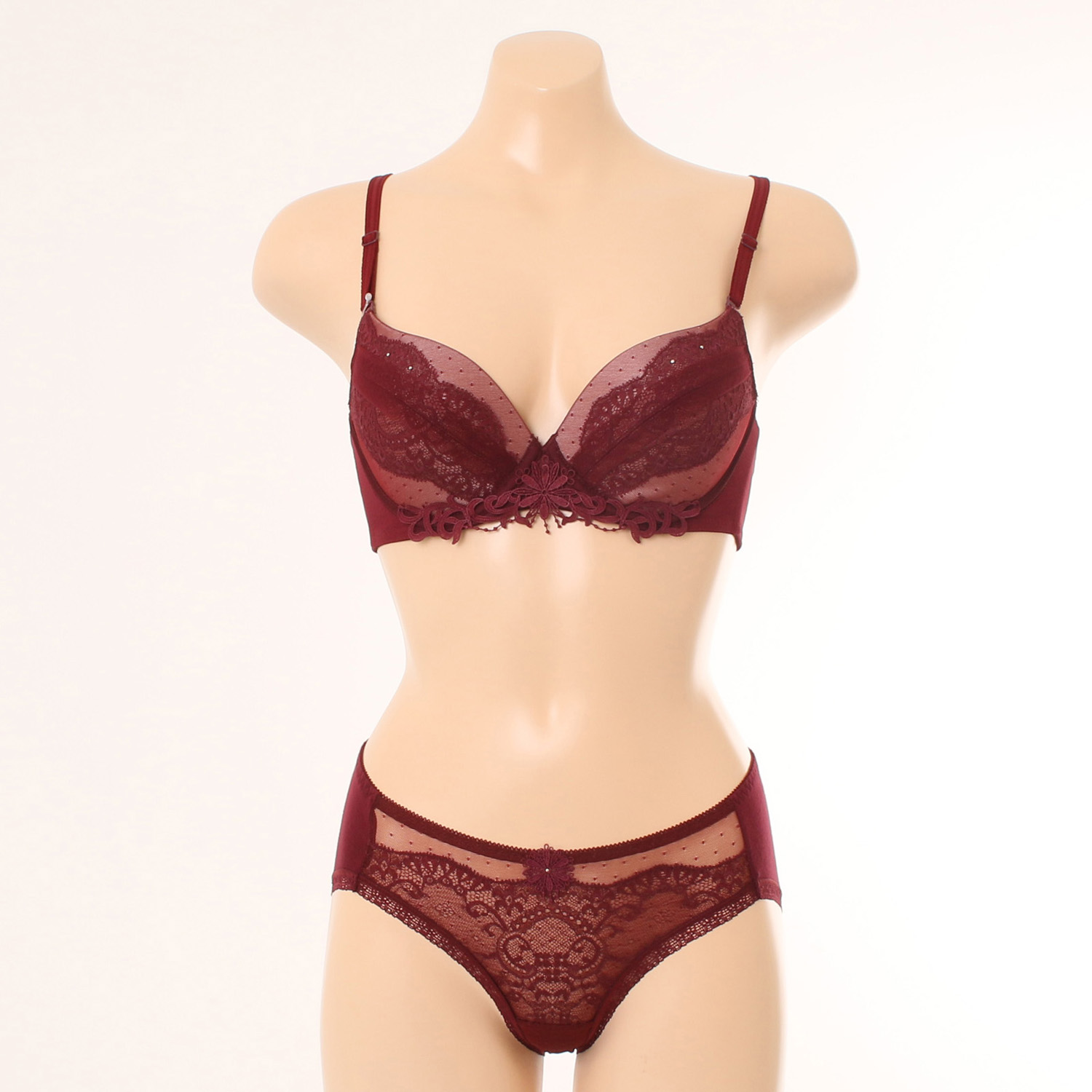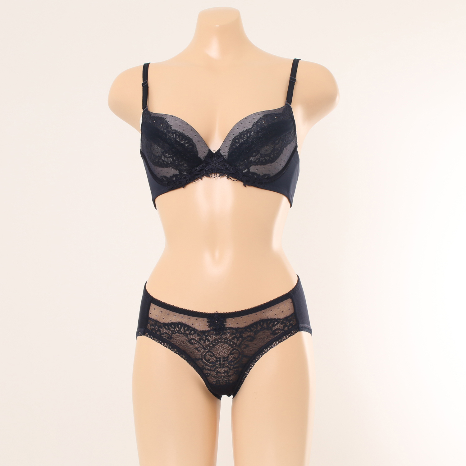시스루하게 비치는 도트와 가슴선을 따라 얹혀진 레이스,