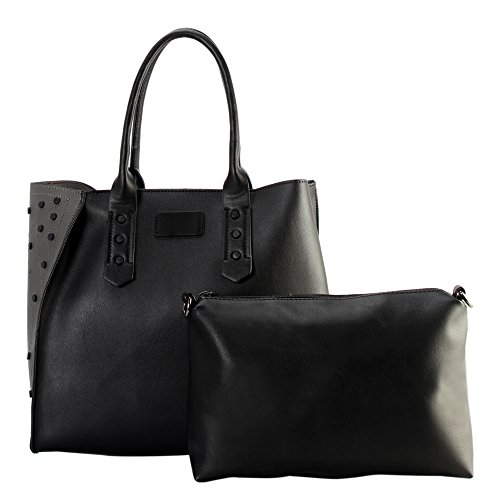 -. Title : Diophy PU Leather Black Studded Décor 2 Tone Tote Handbag 2 Pieces Set XS1-6380