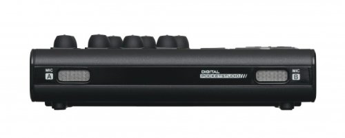 Two omnidirectional condenser microphones are mounted on the front of the main unit.