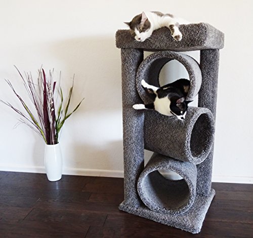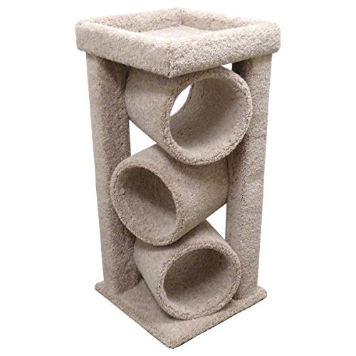 Studio : CozyCatFurniture Publisher : CozyCatFurniture Binding : Misc. Product Description Our Modern Cat Furniture Tower features four resting areas to curl up in or play hide 'n' seek. Its compact design makes it a piece that will fit well in any room yet still offers your cat a nice place to sit up high and feel protected. Your cat wil love this cat tower for large cats. It comes fully assembled ready to use. Overall Size: 20" L x 20" W x 44" H; Covering Material: Plush Carpet; Made of SOLID WOOD, not particle board; Base: 20" x 20"; Three tubes: 11" x 17" (Inside Dimensions); No glue or toxic materials; Ships fully assembled; Proudly hand built in the USA. Carpet color shades may vary. 0