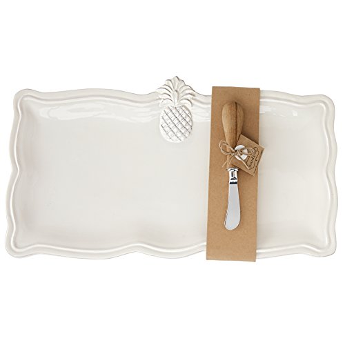 Product Description 2-piece set. Ceramic hostess tray from Mud Pie features texture pineapple icon, detailed edge and arrives with wood handled metal spreader. 0