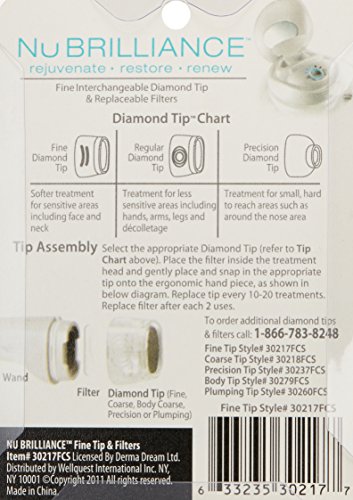 NuBrilliance Fine Diamond Tip is designed to treat wrinkles, fine lines, crow's feet and smile lines around the face and neck. The fine laser-cut diamonds help boost skin cell turnover on the surface layer of the skin, smoothing wrinkles, evening tone and refining skin texture. The fine diamond tip works to renew lackluster, aging skin. Helps reveal healthy and rejuvenated skin. The replacement filters are made of cotton and help trap particles and dead skin cells.Feature