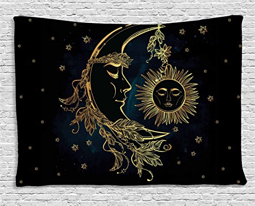 Psychedelic Tapestry by Ambesonne, Crescent Moon with Boho Feathers Alchemy Magic Egyptian Myth Design, Wall Hanging for Bedroom Living Room Dorm, 60WX40L Inches, Golden Petrol Blue