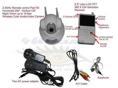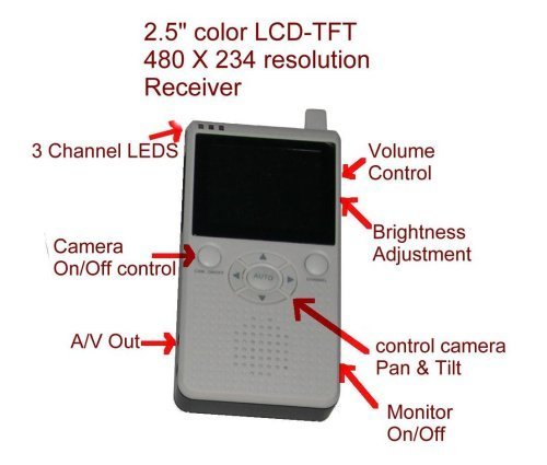 -. Binding : Baby Product -. Brand : 4UCam -. Color : Silver/White -. EAN : 6940391500007 -. Feature : Pan & Tilt (Horizontal 270° Vertical 120°) Scan Camera remotely controlled by hand-held receiver / Large 2.5" Ultra high resolution LCD-TFT color monitor 480 X 234 resolution provides crisp images / 2.4GHz signal penetrates walls floors ceilings up to 330 ft. transmission distance in open space / Night Vision with I/R technology allows viewing in total darkness up to 16 feet / 3 channels in both camera & monitor to avoid possible interference. Monitor support up to 3 cameras -. Label : 4UCam -. Manufacturer : 4UCam -. Model : 860QN -. MPN : 860QN -. PackageQuantity : 1 -. PartNumber : 860QN -. ProductGroup : Baby Product -. ProductTypeName : BABY_PRODUCT -. Publisher : 4UCam -. Studio : 4UCam -. Title : 4UCAM PAN / TILT Handheld 2.5" Color Video Baby Monitor and 2.4GHz Wireless Camera - Day & Night Video & Audio Infant Nursery Monitor
